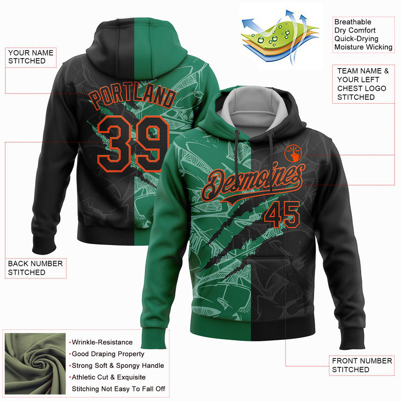 Custom Stitched Graffiti Pattern Black Kelly Green-Orange 3D Scratch Sports Pullover Sweatshirt Hoodie