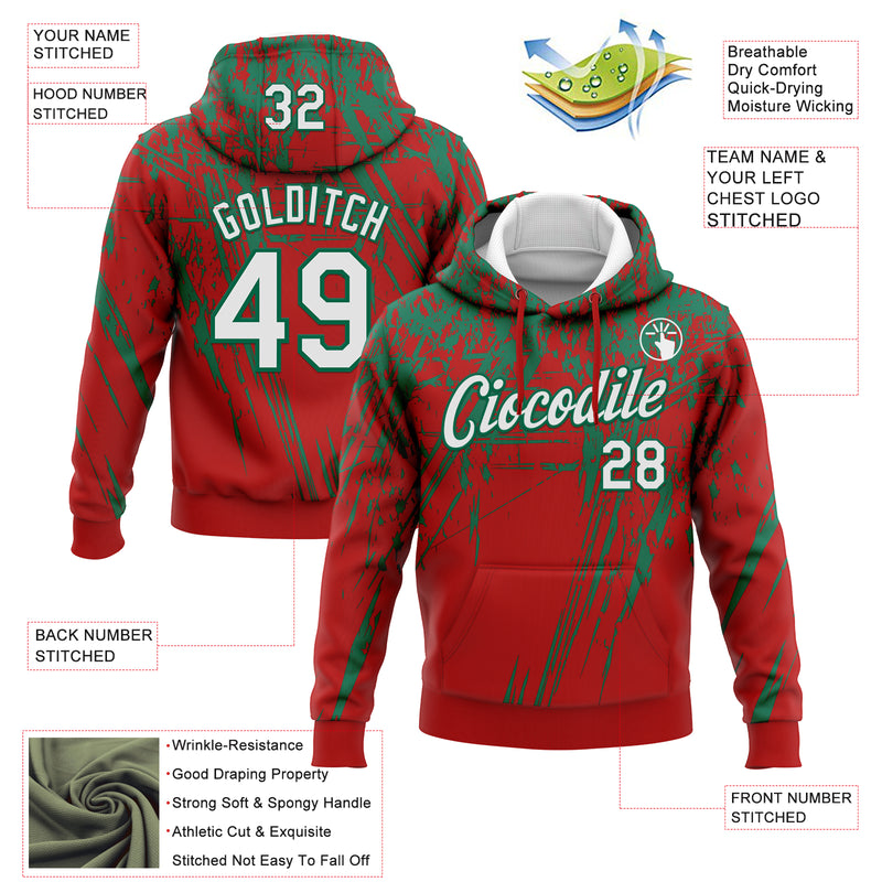 Custom Stitched Red White-Kelly Green 3D Pattern Design Splash Grunge Art Sports Pullover Sweatshirt Hoodie