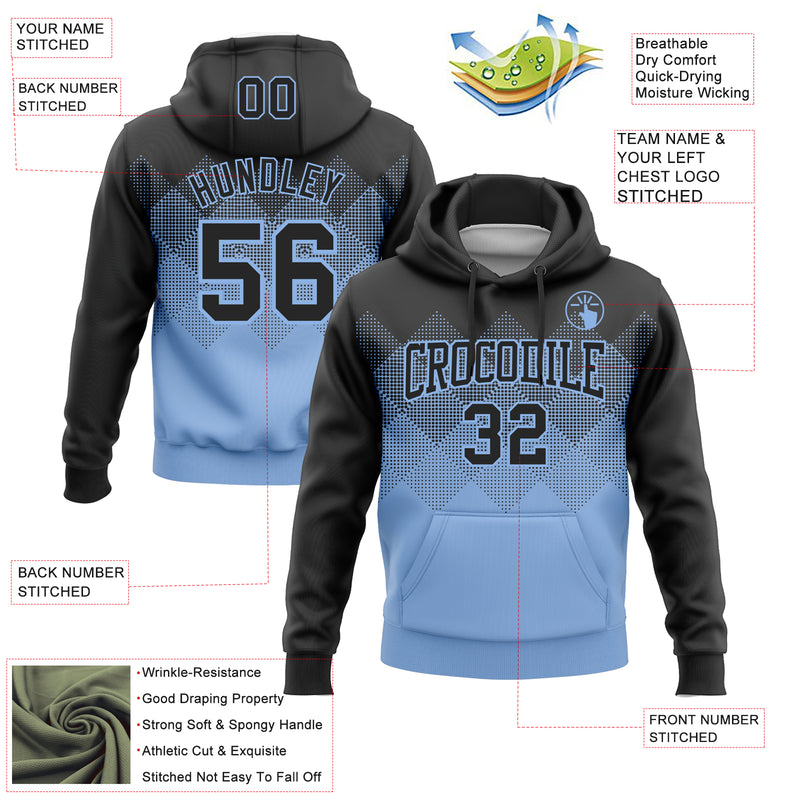 Custom Stitched Black Light Blue 3D Pattern Design Gradient Square Shape Sports Pullover Sweatshirt Hoodie