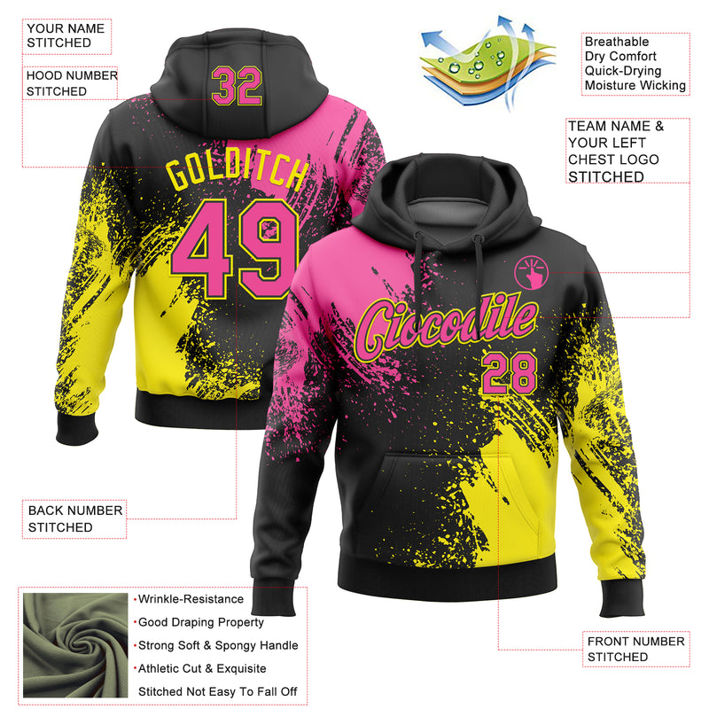 Custom Stitched Black Pink-Light Yellow 3D Pattern Design Abstract Brush Stroke Sports Pullover Sweatshirt Hoodie