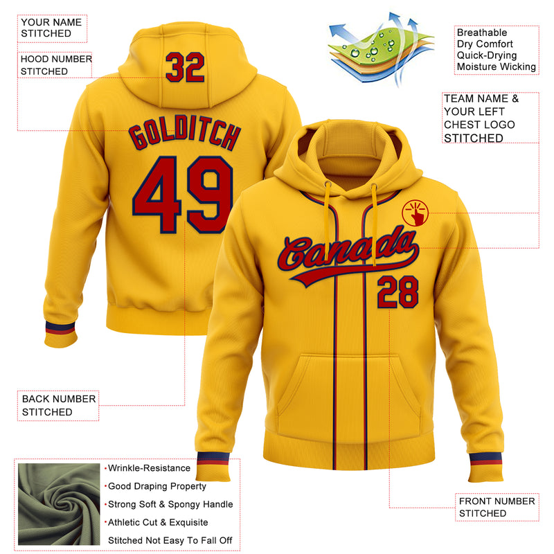 Custom Stitched Gold Red-Navy Baseball Pullover Sweatshirt Hoodie