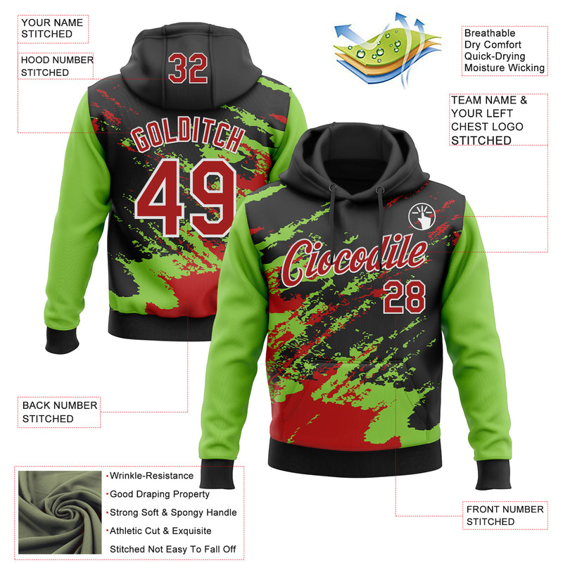Custom Stitched Black Red Neon Green-White 3D Pattern Design Abstract Fragment Art Splash Sports Pullover Sweatshirt Hoodie