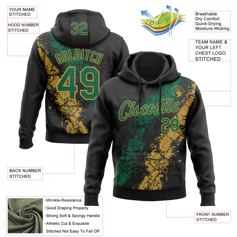 Custom Stitched Black Kelly Green-Old Gold Splash Sports Pullover Sweatshirt Hoodie