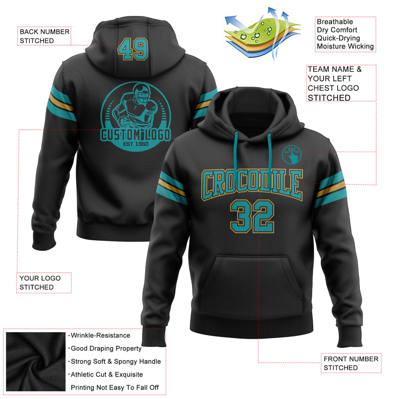 Custom Stitched Black Teal-Old Gold Football Pullover Sweatshirt Hoodie