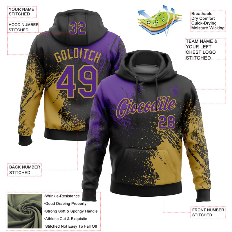Custom Stitched Black Purple-Old Gold 3D Pattern Design Abstract Brush Stroke Sports Pullover Sweatshirt Hoodie