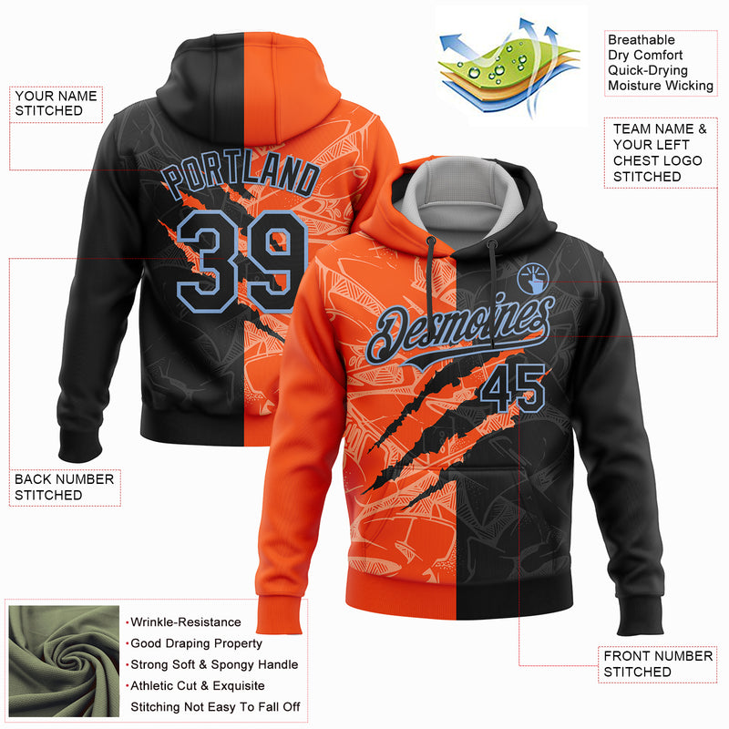 Custom Stitched Graffiti Pattern Black Orange-Light Blue 3D Scratch Sports Pullover Sweatshirt Hoodie