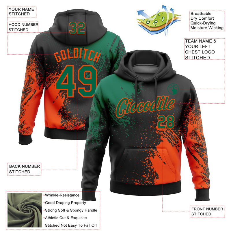 Custom Stitched Black Kelly Green-Orange 3D Pattern Design Abstract Brush Stroke Sports Pullover Sweatshirt Hoodie