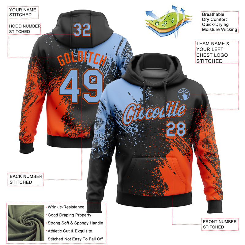 Custom Stitched Black Light Blue-Orange 3D Pattern Design Abstract Brush Stroke Sports Pullover Sweatshirt Hoodie