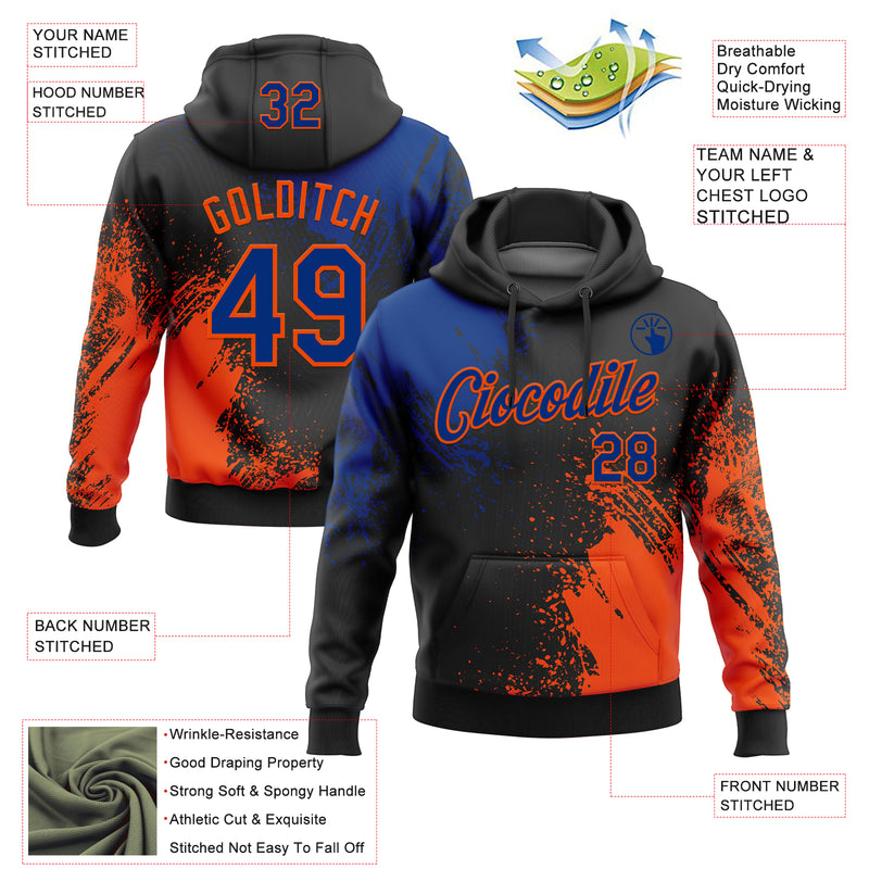 Custom Stitched Black Royal-Orange 3D Pattern Design Abstract Brush Stroke Sports Pullover Sweatshirt Hoodie