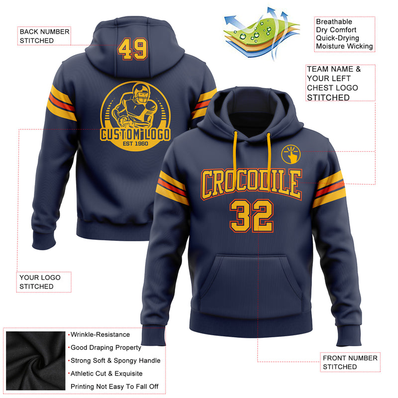 Custom Stitched Navy Gold-Orange Football Pullover Sweatshirt Hoodie