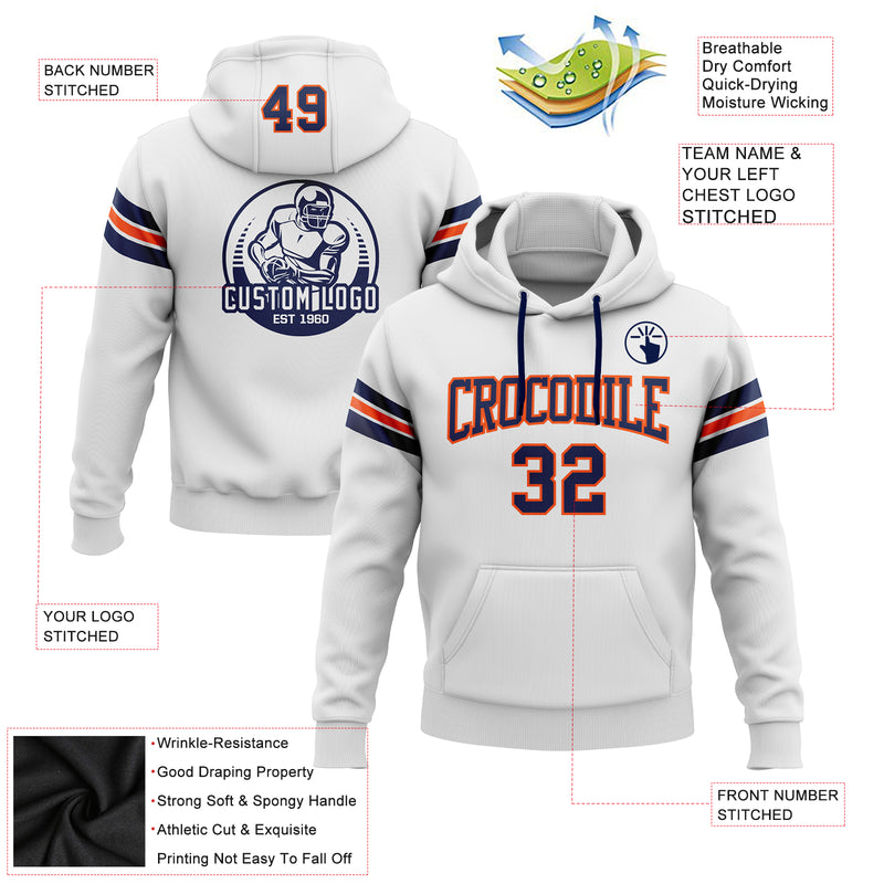 Custom Stitched White Navy-Orange Football Pullover Sweatshirt Hoodie