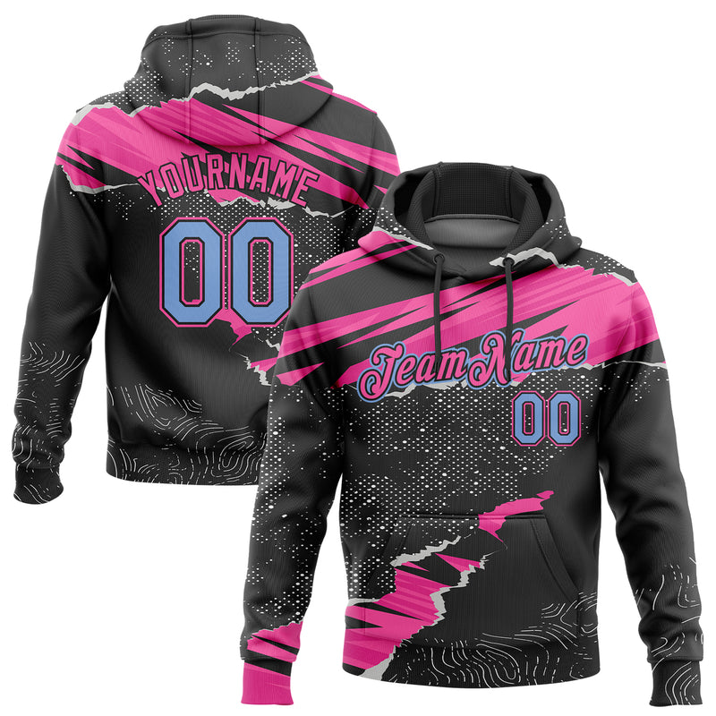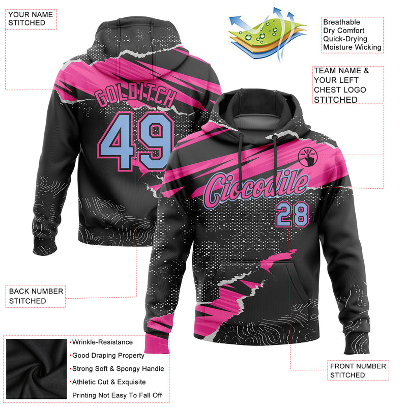Custom Stitched Black Light Blue-Pink 3D Pattern Design Torn Paper Style Sports Pullover Sweatshirt Hoodie