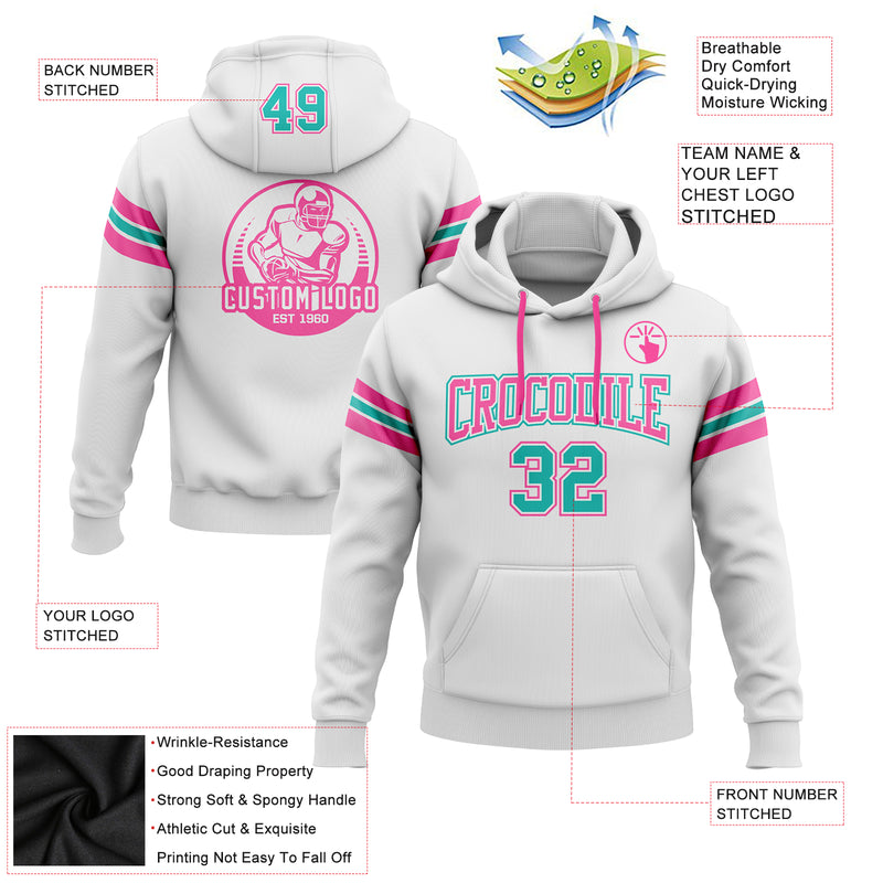 Custom Stitched White Aqua-Pink Football Pullover Sweatshirt Hoodie