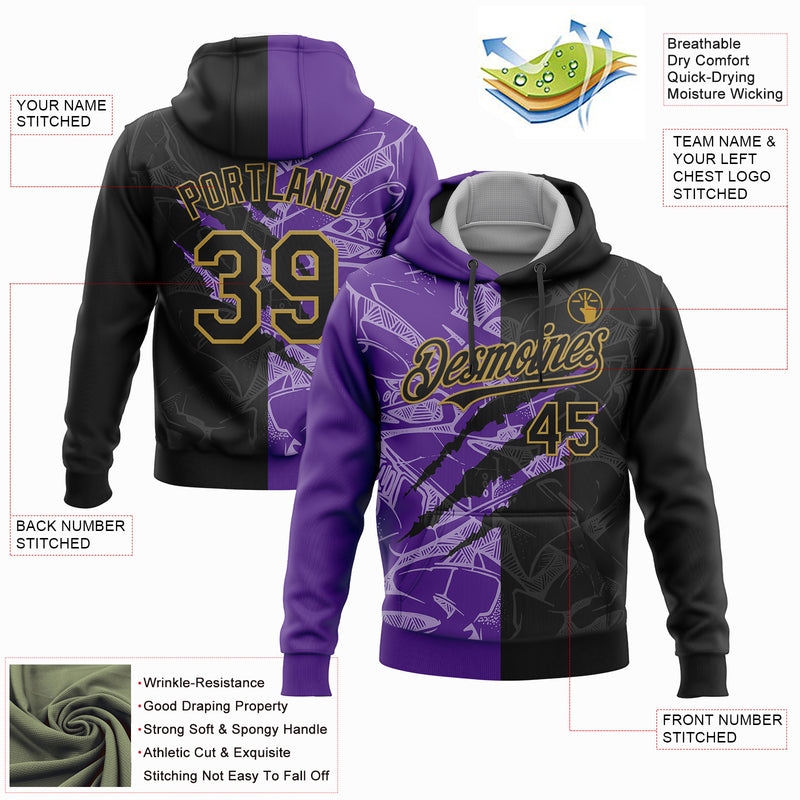 Custom Stitched Graffiti Pattern Black Purple-Old Gold 3D Scratch Sports Pullover Sweatshirt Hoodie