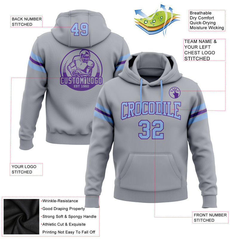 Custom Stitched Gray Light Blue-Purple Football Pullover Sweatshirt Hoodie