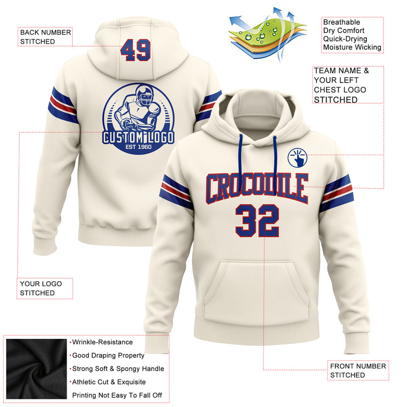 Custom Stitched Cream Royal-Red Football Pullover Sweatshirt Hoodie
