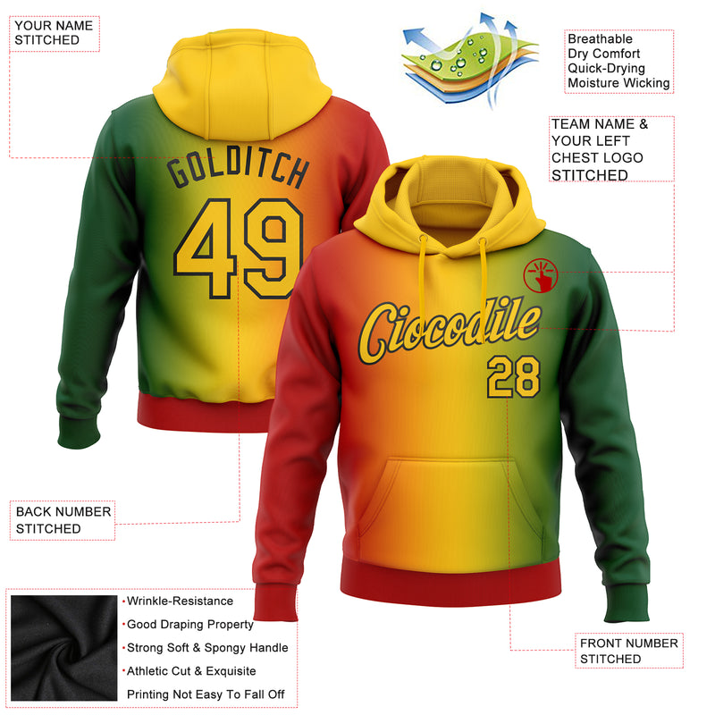 Custom Stitched Green Yellow Red-Black 3D Pattern Design Gradient Fashion Black History Month Sports Pullover Sweatshirt Hoodie
