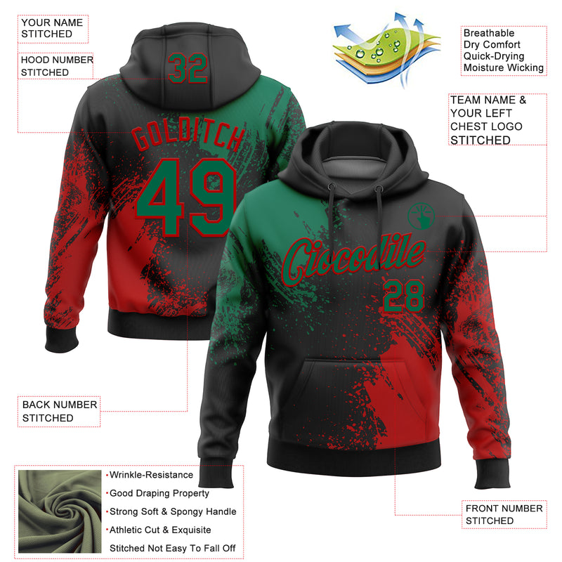 Custom Stitched Black Kelly Green-Red 3D Pattern Design Abstract Brush Stroke Sports Pullover Sweatshirt Hoodie