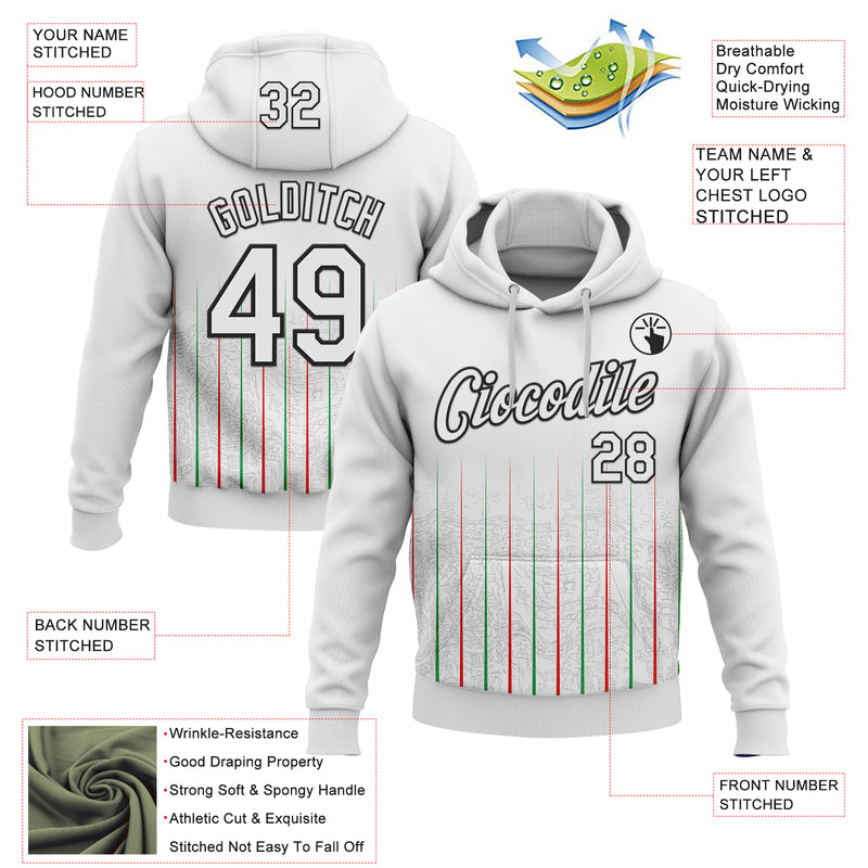 Custom Stitched White Red Green-Black 3D Pattern Design Line Sports Pullover Sweatshirt Hoodie