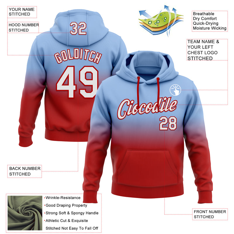 Custom Stitched Light Blue White-Red Fade Fashion Sports Pullover Sweatshirt Hoodie