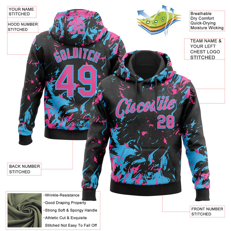 Custom Stitched Black Pink-Sky Blue Splash Sports Pullover Sweatshirt Hoodie