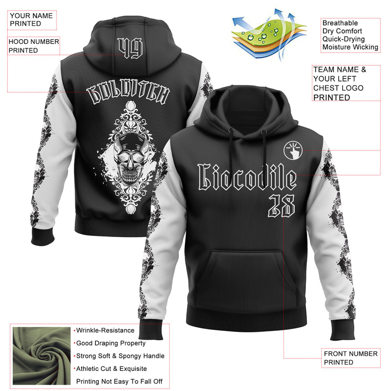 Custom Black White 3D Skull Gothic Floral Pattern Diamond Grid Sports Pullover Sweatshirt Hoodie
