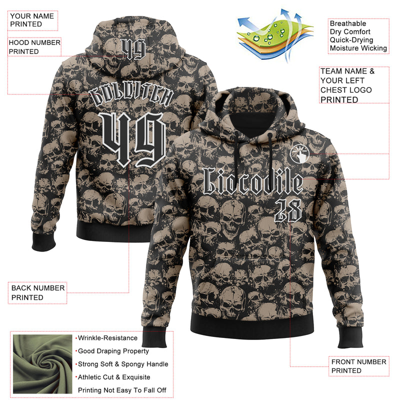 Custom Black White 3D Skull Gothic Vintage Grunge Art Sports Pullover Sweatshirt Hoodie