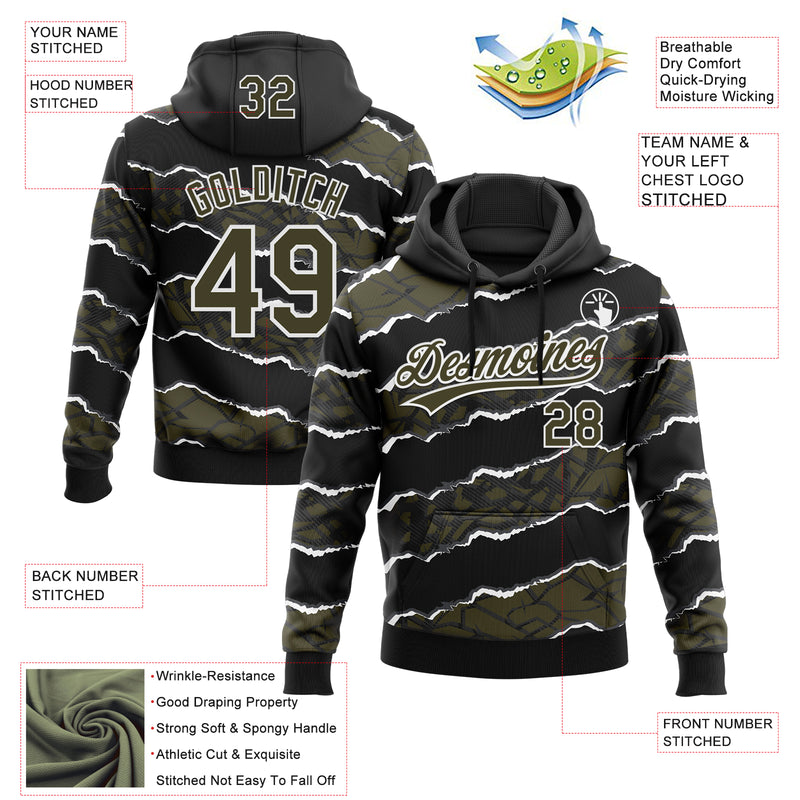 Custom Stitched Black Olive-White 3D Pattern Design Torn Paper Style Sports Pullover Sweatshirt Hoodie