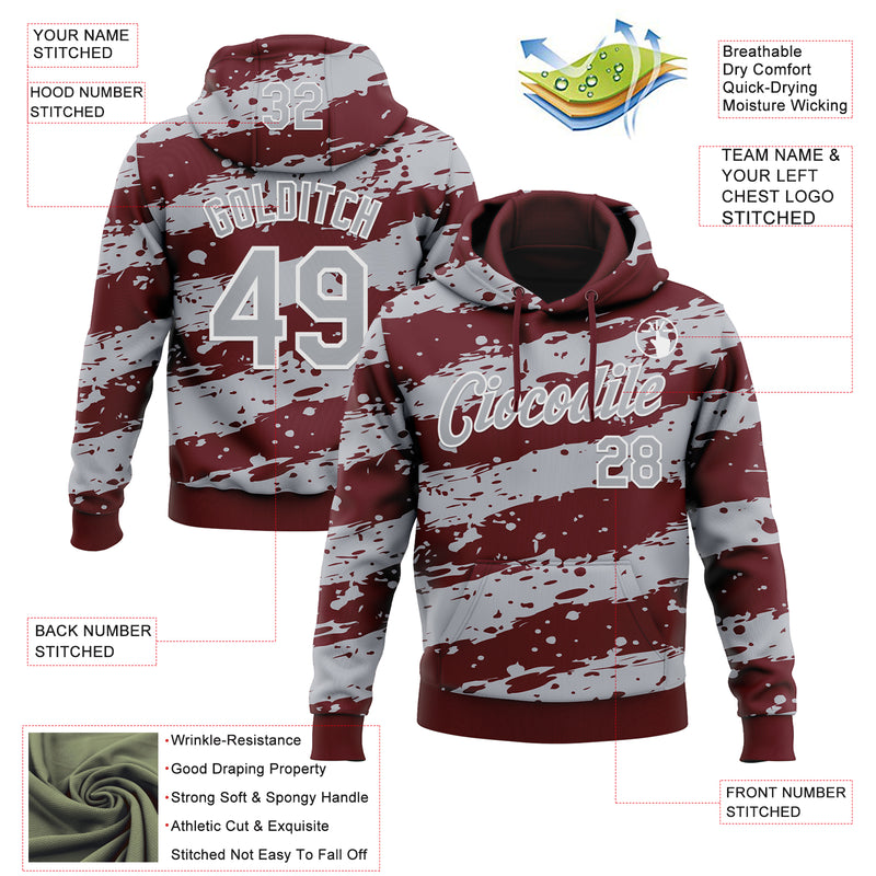 Custom Stitched Burgundy Gray-White Splash Torn Paper Style Sports Pullover Sweatshirt Hoodie