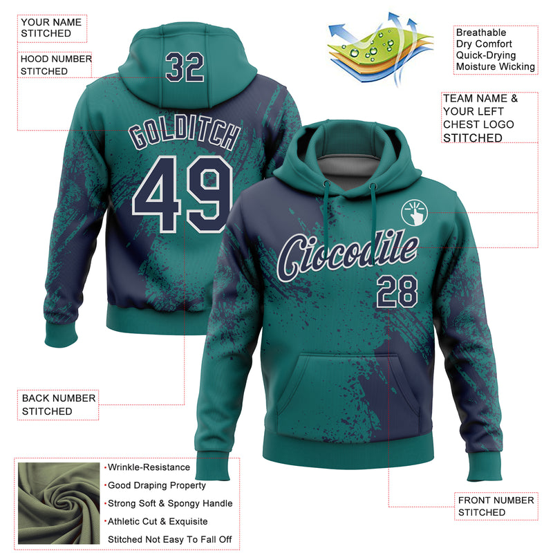 Custom Stitched Teal Navy-White 3D Pattern Design Abstract Brush Stroke Sports Pullover Sweatshirt Hoodie
