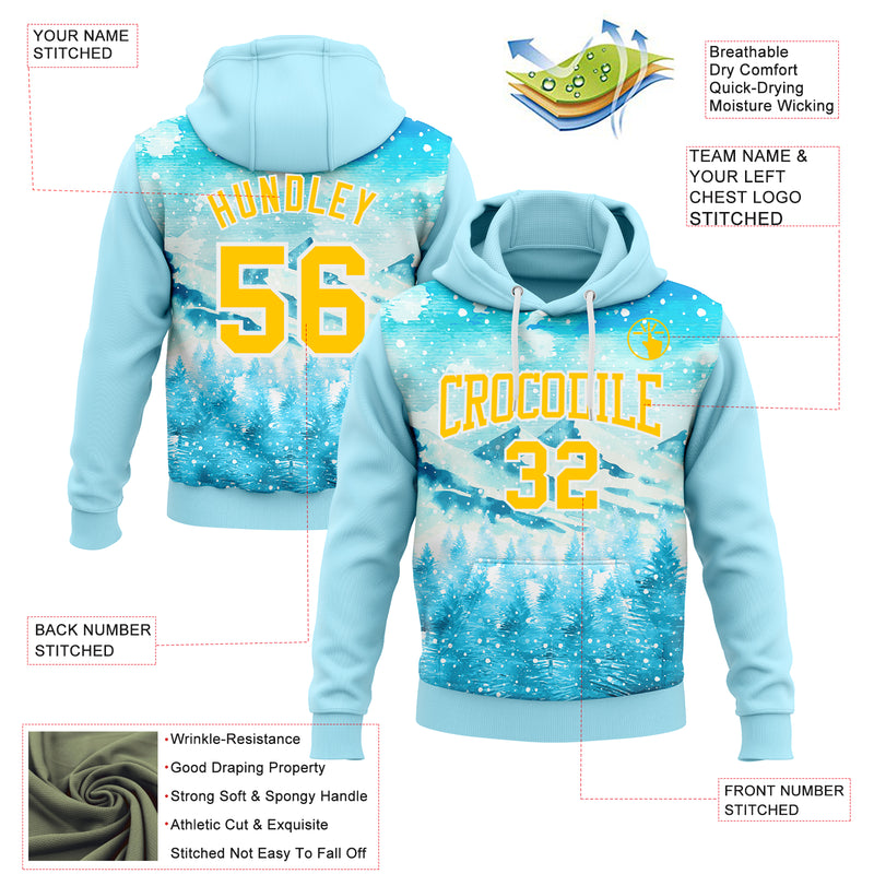 Custom Stitched Lakes Blue Yellow-White Christmas Snowflakes 3D Sports Pullover Sweatshirt Hoodie