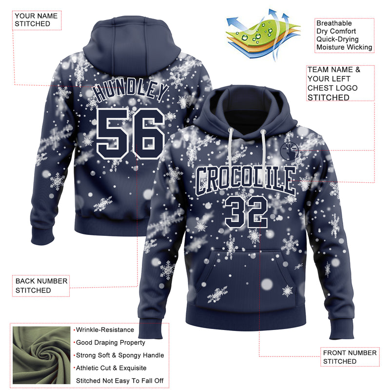 Custom Stitched Navy White Christmas Snowflakes 3D Sports Pullover Sweatshirt Hoodie