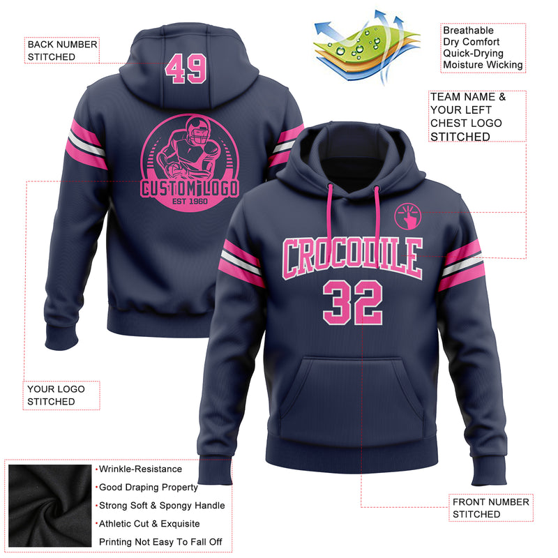 Custom Stitched Navy Pink-White Football Pullover Sweatshirt Hoodie