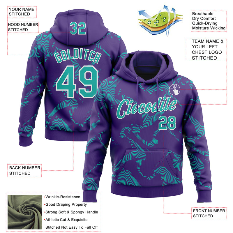 Custom Stitched Purple Aqua-White Curve Lines Sports Pullover Sweatshirt Hoodie