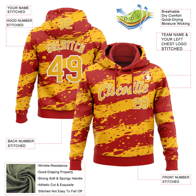 Custom Stitched Red Gold-White Splash Torn Paper Style Sports Pullover Sweatshirt Hoodie