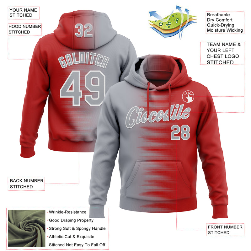 Custom Stitched Red Gray-White Gradient Line Sports Pullover Sweatshirt Hoodie
