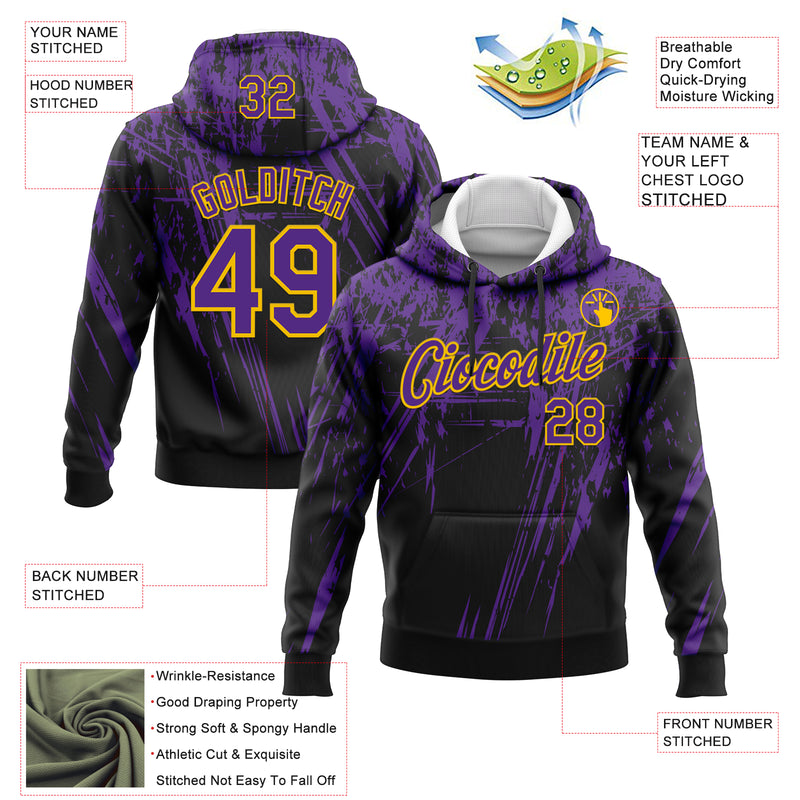 Custom Stitched Black Purple-Yellow 3D Pattern Design Splash Grunge Art Sports Pullover Sweatshirt Hoodie