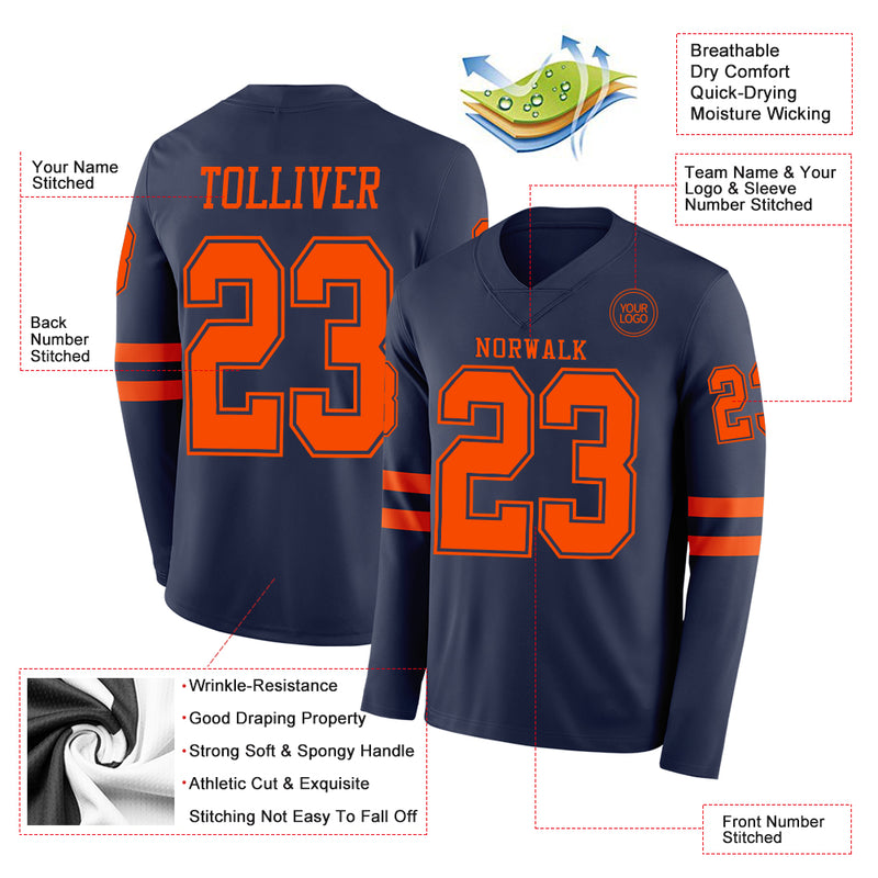 Custom Navy Orange Long Sleeve Authentic Football Jersey
