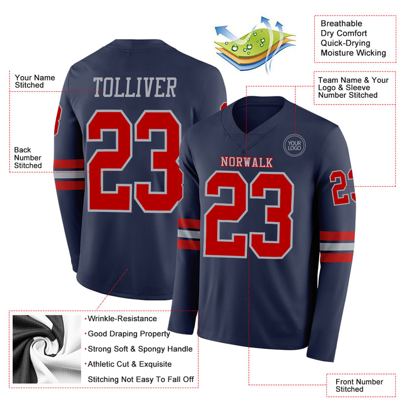 Custom Navy Red-Gray Long Sleeve Authentic Football Jersey