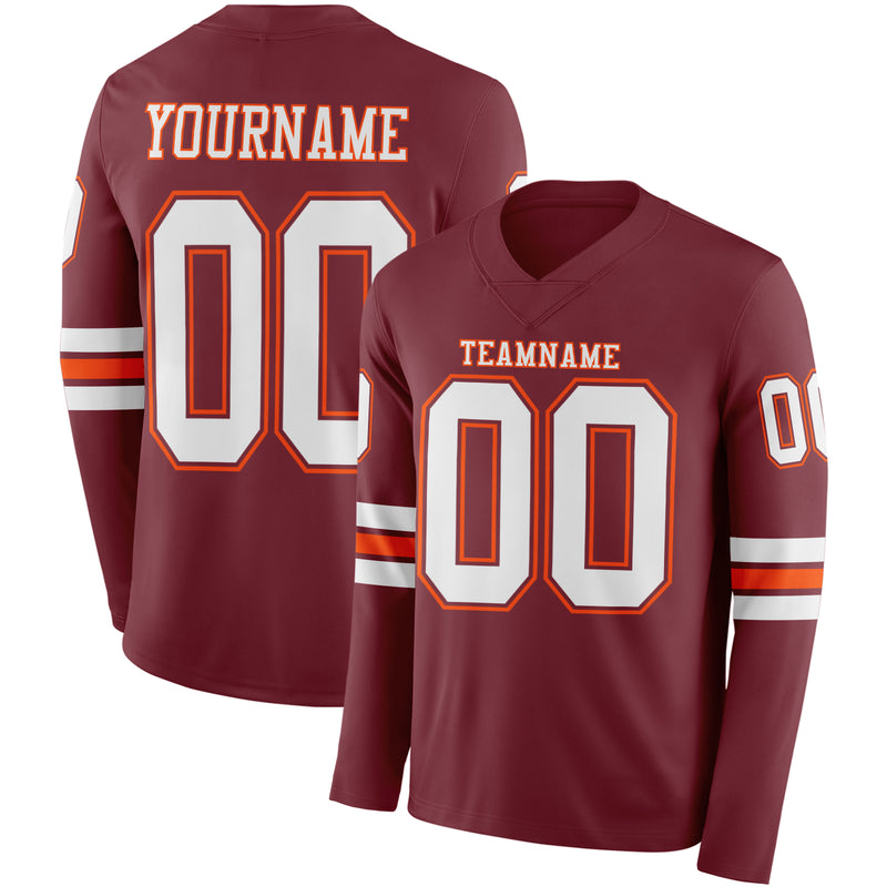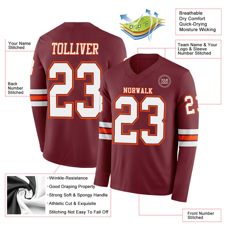 Custom Burgundy White-Orange Long Sleeve Authentic Football Jersey