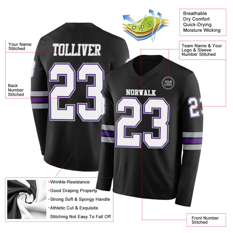 Custom Black White Purple-Gray Long Sleeve Authentic Football Jersey