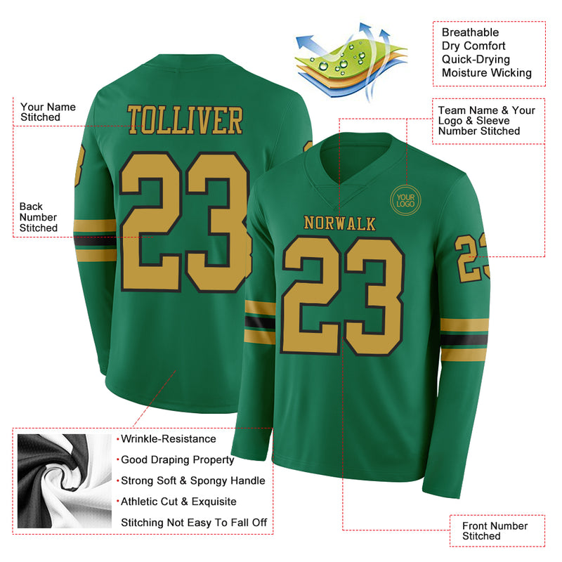 Custom Kelly Green Old Gold-Black Long Sleeve Authentic Football Jersey