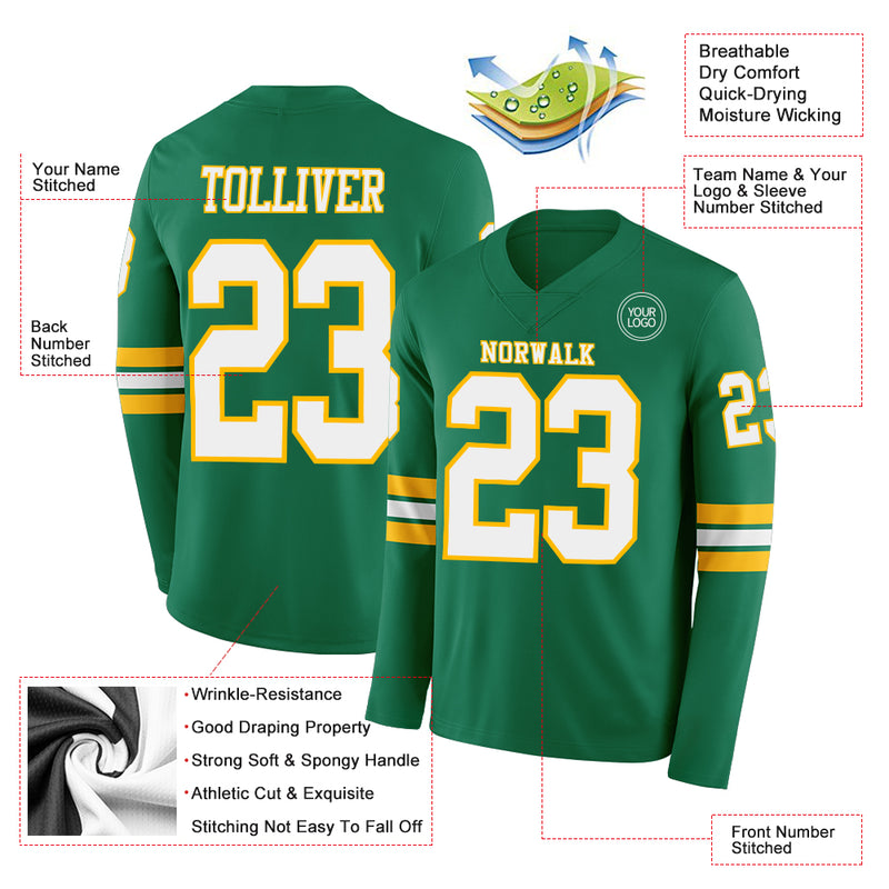 Custom Kelly Green White-Gold Long Sleeve Authentic Football Jersey