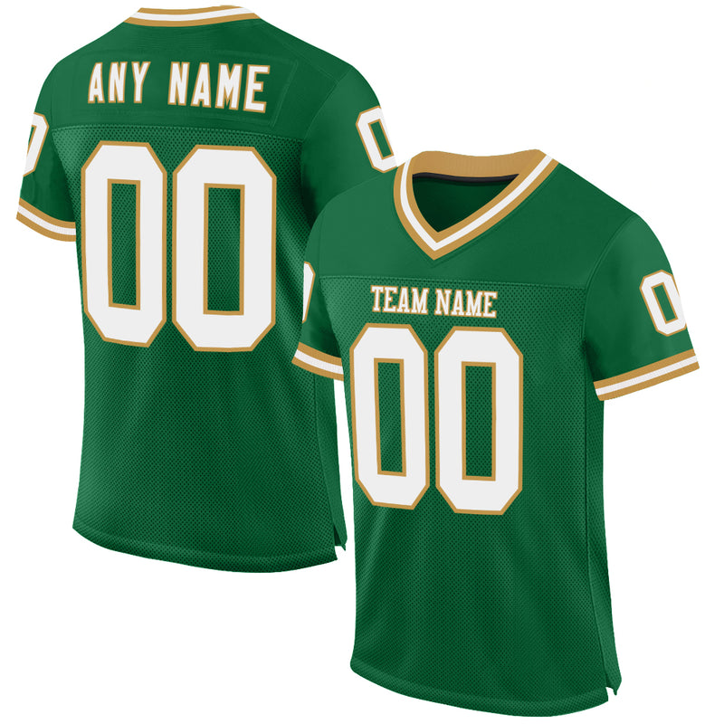 Custom Kelly Green White-Old Gold Mesh Authentic Throwback Football Jersey