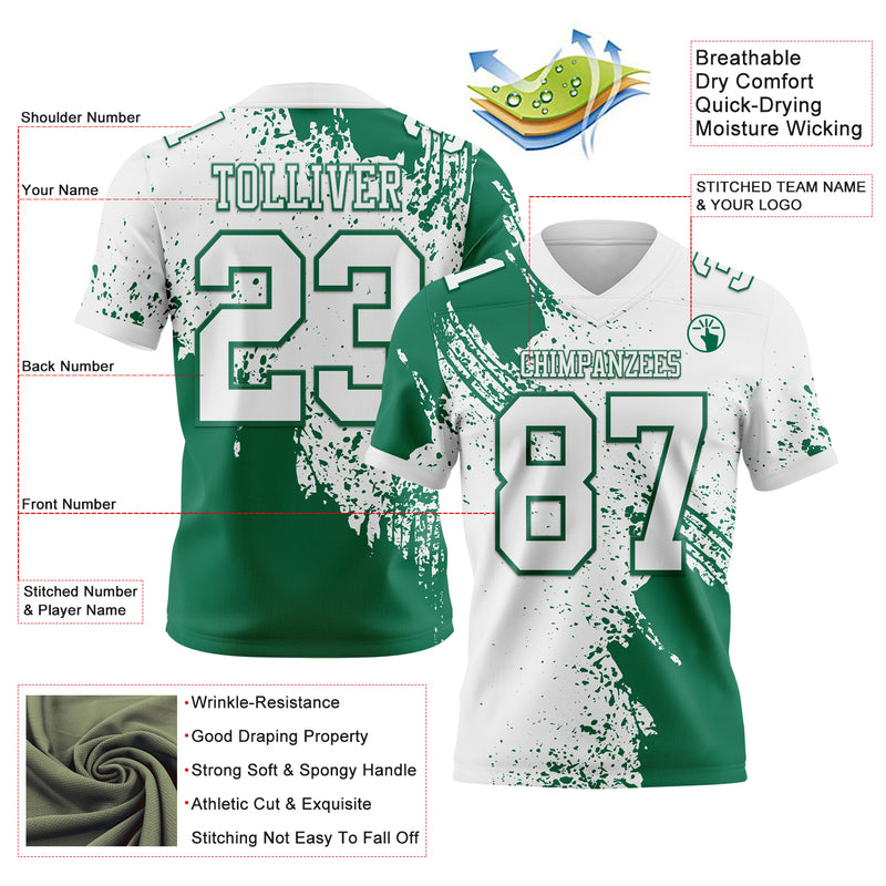 Custom White Kelly Green 3D Pattern Abstract Brush Stroke Authentic Football Jersey