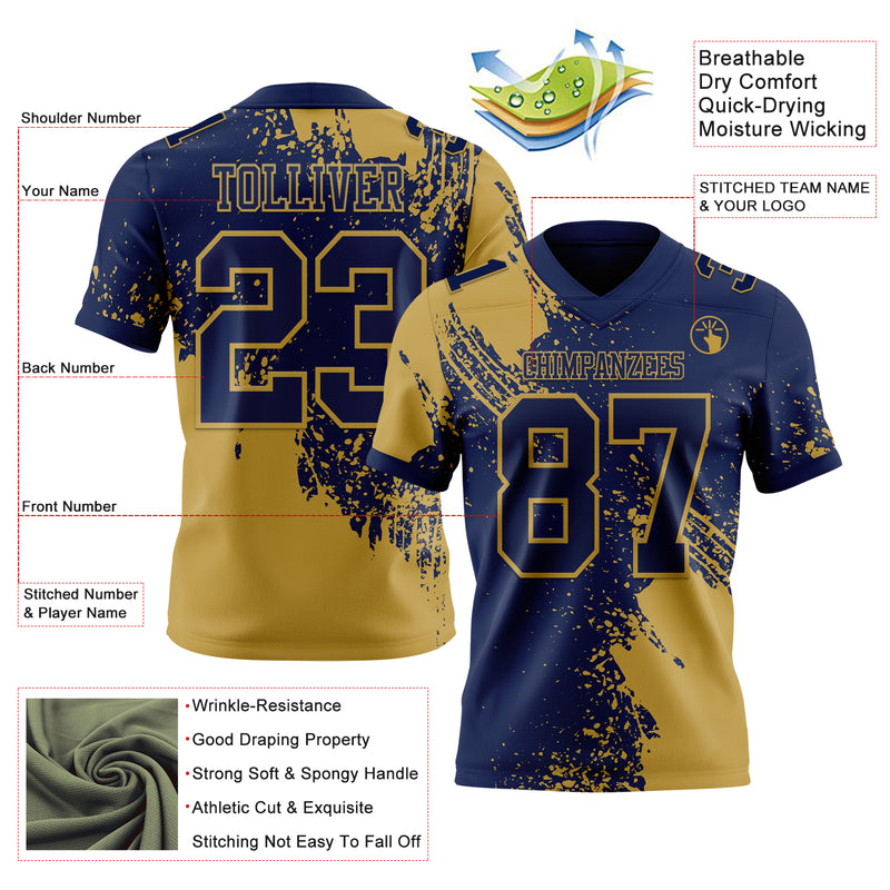 Custom Navy Old Gold 3D Pattern Abstract Brush Stroke Authentic Football Jersey
