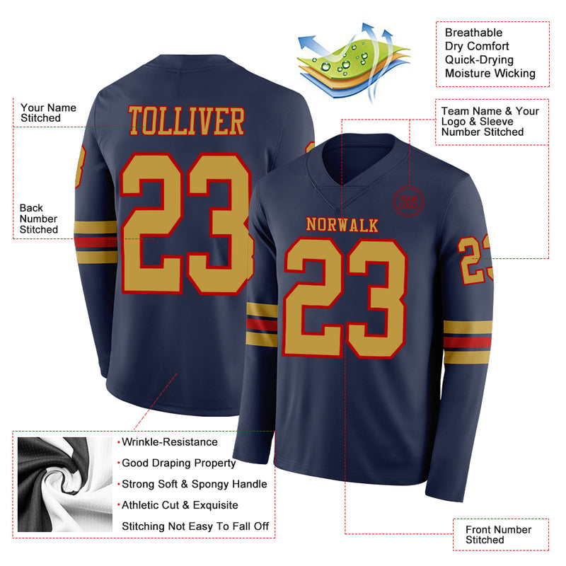 Custom Navy Old Gold-Red Long Sleeve Authentic Football Jersey