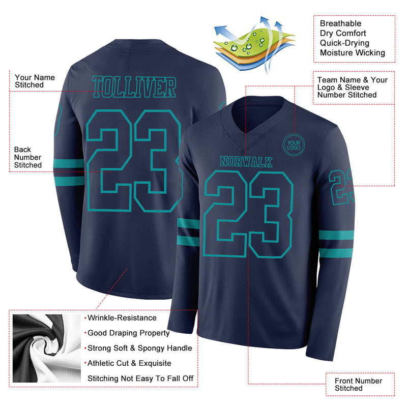 Custom Navy Teal Long Sleeve Authentic Football Jersey