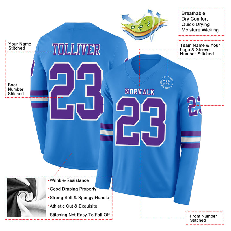 Custom Powder Blue Purple-White Long Sleeve Authentic Football Jersey