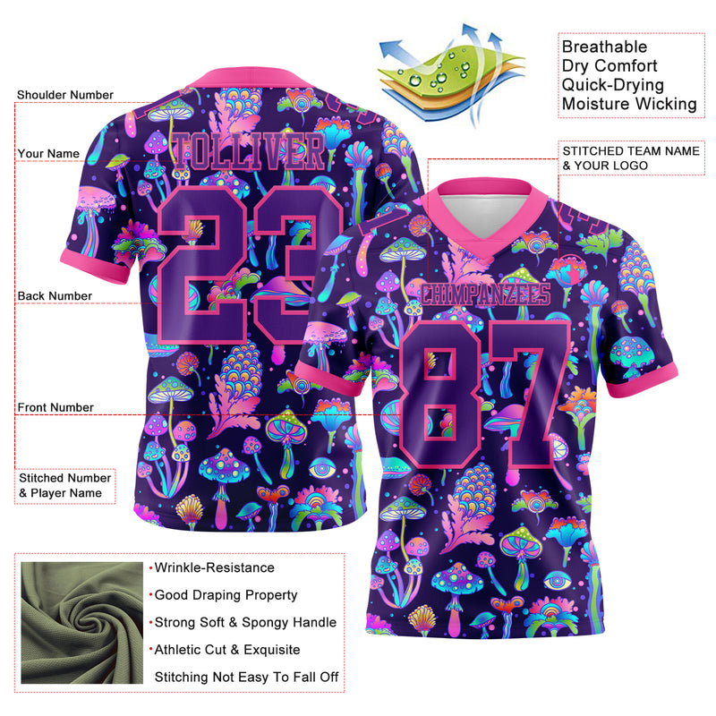 Custom Purple Pink 3D Pattern Colorful Flowers And Mushrooms Psychedelic Hallucination Authentic Football Jersey